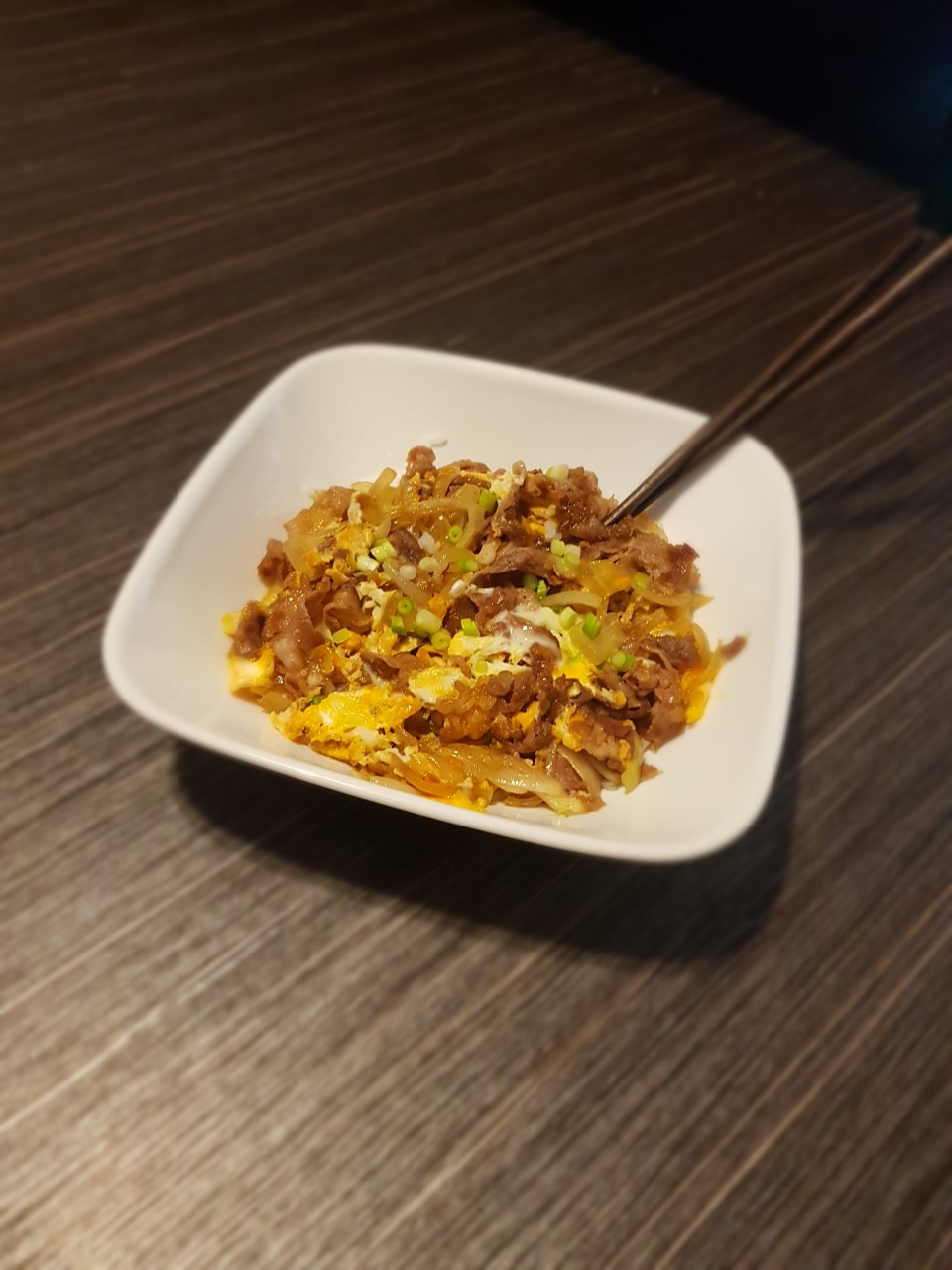 - Place the beef and egg on top of steamed rice, pour the desired amount of cooking sauce, and top with green onion.